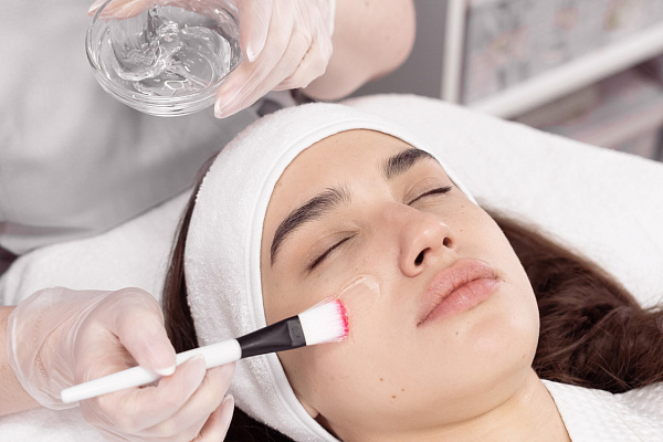 - По лицу распределяется пилинг с кислотами. Он мягко отшелушивает омертвевшие клетки и подготавливает дерму к глубокому воздействию.